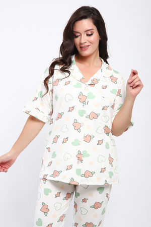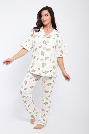 Женская пижама состоит из рубашки и брюк. В этом ансамбле вы найдете все - трендовая расцветка, идеальная посадка, широкий размерный ряд. Рубашка свободного покроя застегивается на 5 пуговиц, на груди накладной карман. Брюки прямого покроя с карманами по бокам. Выглядеть прекрасно дома - это просто.
