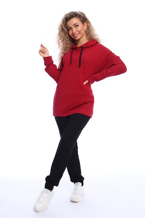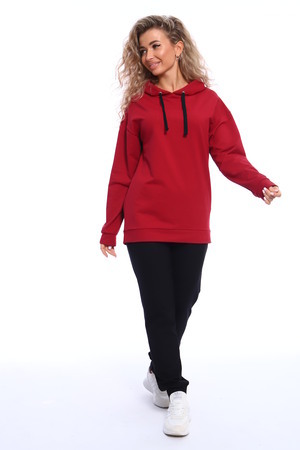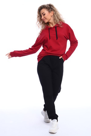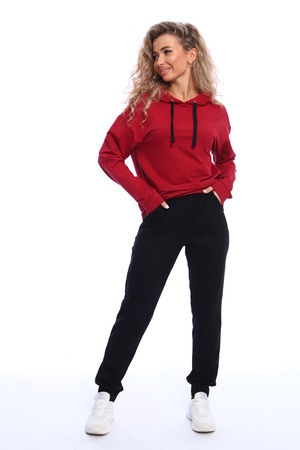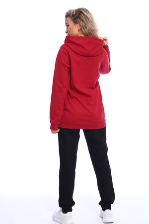 Костюм состоит из толстовки и брюк. Толстовка прямого кроя с капюшоном на завязках, рукава на манжетах. Брюки полуприлегающего силуэта с боковыми карманами, эластичным поясом на резинке и манжетами. Оригинальное сочетание рисунка толстовки и черных брюк.