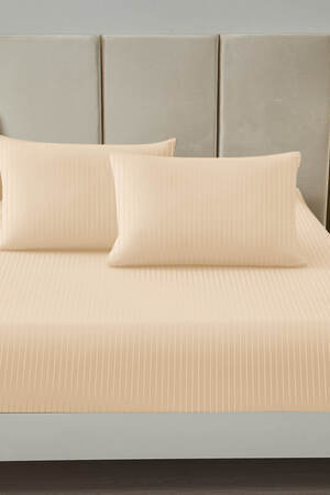 Ткань представляет собой сатин с жаккардовым плетением, в результате чего образуется однотонный рисунок в виде выразительных полос, изредка – в виде квадратов или прямоугольников. Страйп-сатин - от английского слова «stripes», в переводе обозначающее «полосы». Материал очень красивый, элитарный, глянцевые полосы здесь чередуются с матовыми, при этом изнаночная и лицевая стороны выглядят одинаково. Состав ткани страйп-сатина для постельного белья полностью натуральный – здесь присутствует только хлопковая нить высокого качества. Для пошива постельных принадлежностей используется полотно с плотностью расположения нитей 120-150 г/м², что обеспечивает хорошую мягкость и прочность белья. По завершению плетения выполняется мерсеризация полотна – обработка раствором каустической соды. Такая процедура увеличивает блеск поверхности, плотность и прочность ткани, служит защитой от выгорания.