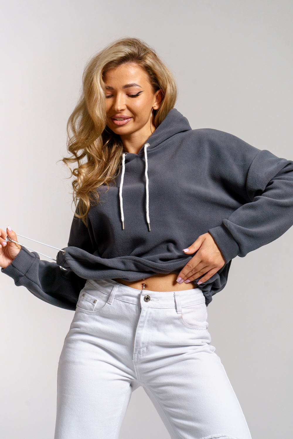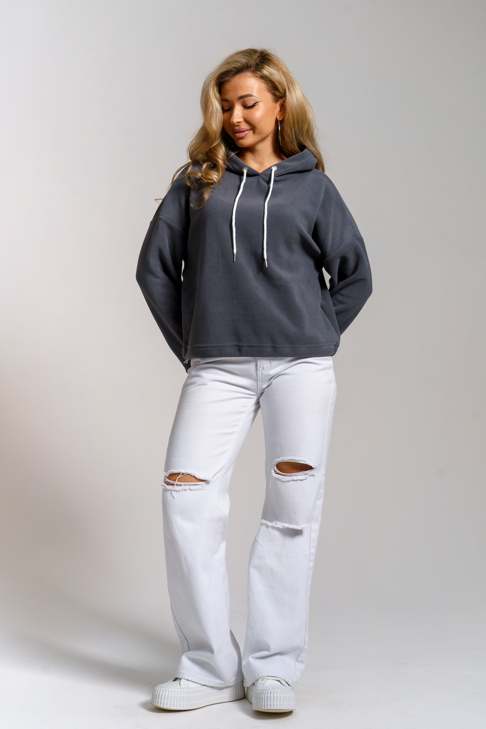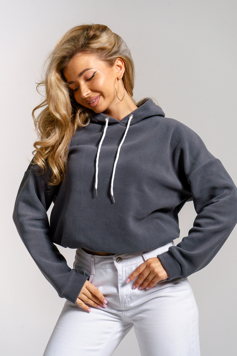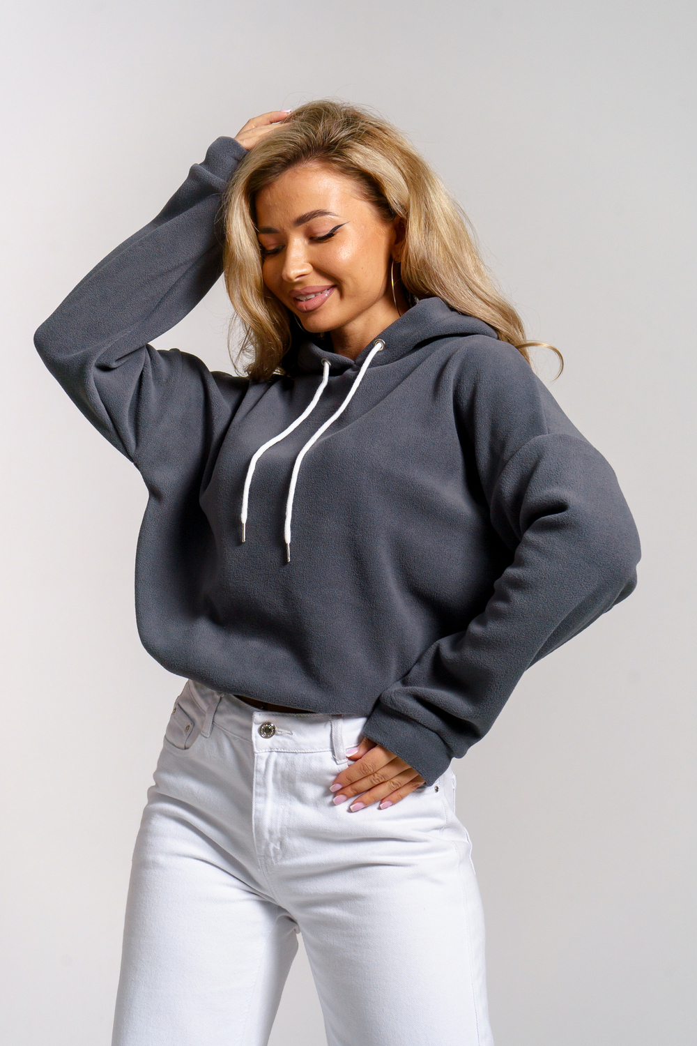 Женская толстовка выполнена из флиса  высокого качества. Флис - ткань с ворсистой поверхностью, что позволяет эффективно сохранять тепло. Материал прочный, эластичный, влагостойкий. Хорошо пропускает влагу, при этом не впитывает ее. По теплостойкости превосходит шерсть, но намного легче. Воздухопроницаемая гигроскопичная ткань создает для тела комфортный микроклимат. Материал гипоаллергенный, подходит для изготовления одежды детям, в том числе новорожденным. Изделия из флиса легкие, не мнутся, не деформируются, не вытягиваются. В такой одежде удобно и комфортно. Эластичность материала позволяет легко двигаться. Толстовка с капюшоном и шнурком. Линия плеча спущена, длинный рукав. По низу толстовки имеется резинка с фиксатором, с помощью которой Вы можете собрать изделие как вам хочется и нравится. Свободный крой прекрасно будет смотреться на дамах с любыми формами. Толстовка такого плана представлена в широкой размерной сетке, что позволяет выбрать её как девушке, так и женщине. Однотонная толстовка модных расцветок будет удачным выбором для поездок в отпуск, на пикник, для школы, для активного отдыха и прогулок по городу. Будет гармонично сочетаться с брюками, джинсами, кроссовками и ботинками. Используя эту модель в качестве домашней одежды Вы поймёте, что это именно тот самый идеальный вариант, в котором  будете себя чувствовать удобно, комфортно и современно. Толстовка - это настоящая находка для тех, кто ценит свою индивидуальность!