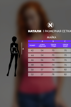 Покупатель на Ozon18.03.2026 в 16:01Майка красивая, яркая, плотная. На 96-80-96 р48 очень туго в подмышках. Майка маломерит конкретно. Отдала дочери. На 44р прекрасно