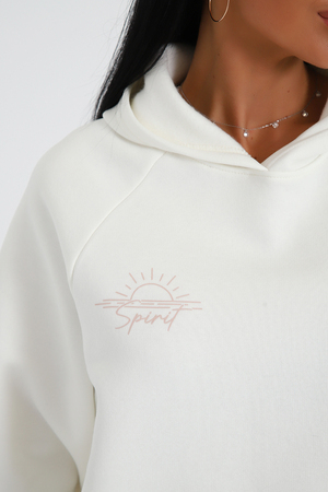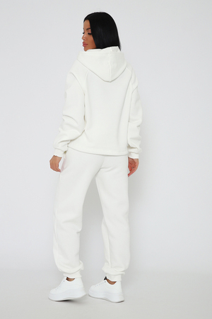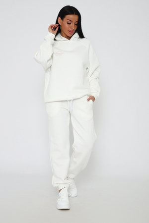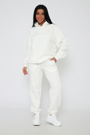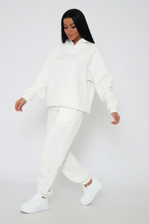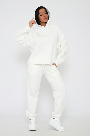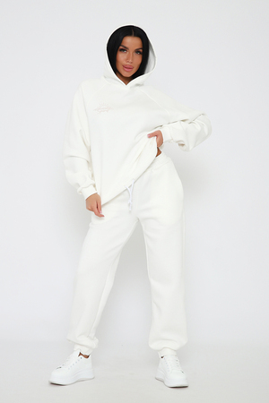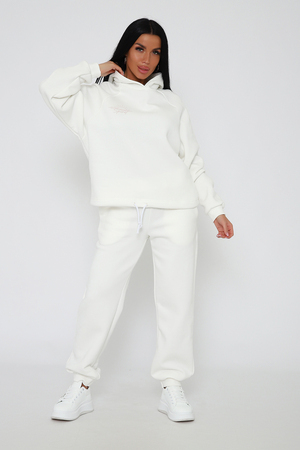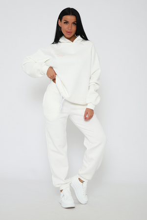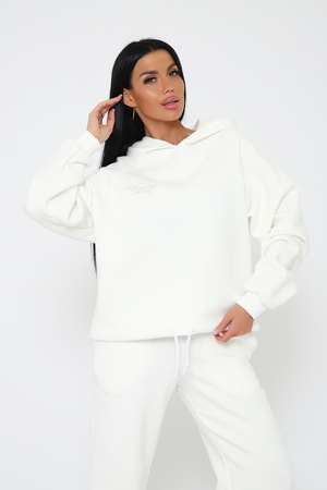 Костюм из облегченного футера с начесом прекрасно садится по фигуре за счет мягкости и дарит комфорт благодаря начесу. Дополнительная фишка печать на рукаве и полочке. В отделке использовано кашкорсе на рукавах и брюках, низ толстовки украшает декоративный шнур.