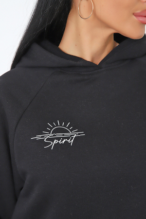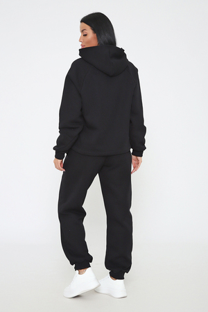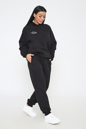 Костюм из облегченного футера с начесом прекрасно садится по фигуре за счет мягкости и дарит комфорт благодаря начесу. Дополнительная фишка печать на рукаве и полочке. В отделке использовано кашкорсе на рукавах и брюках, низ толстовки украшает декоративный шнур.