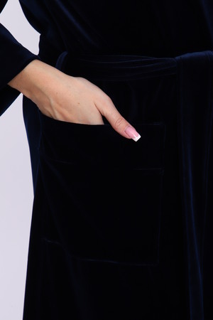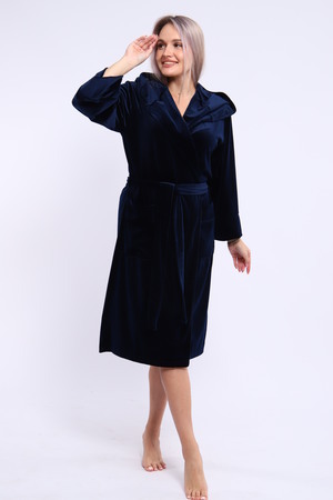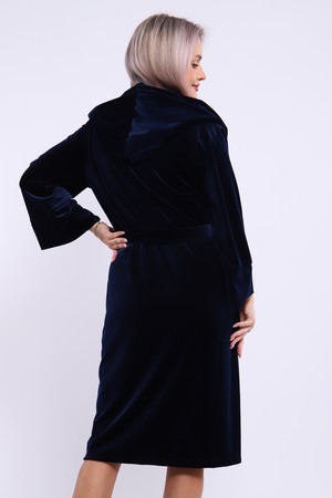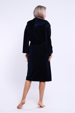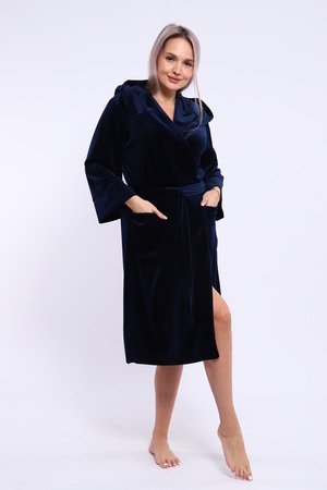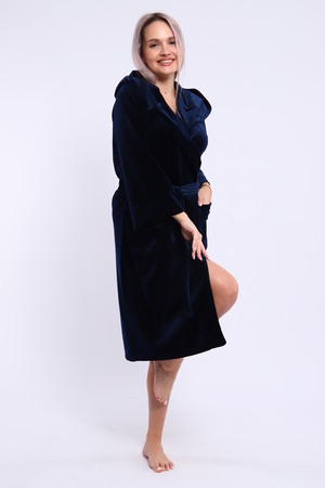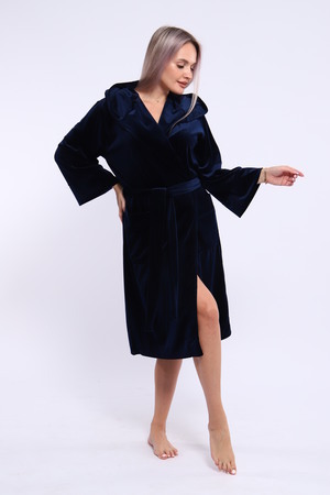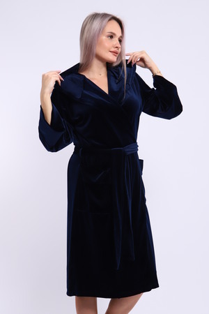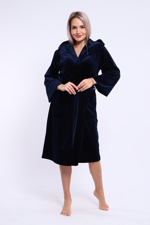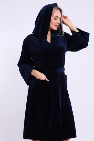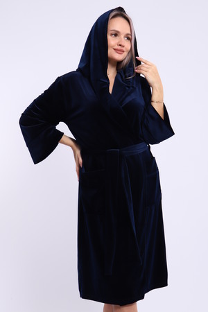 Халат женский на запах из ткани велюр. Халат на запах с поясом и с капюшоном, карманы по бокам настрочные, рукав 3/4 широкие с манжетами. Длина халата средняя, размер полный. Цвета насыщенные благородные с переливом.