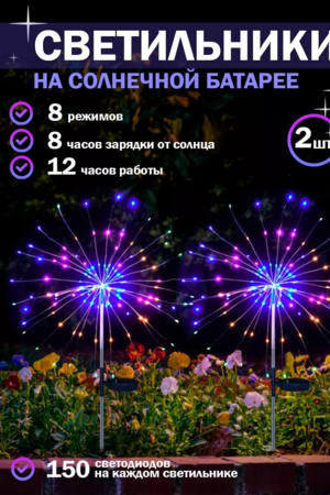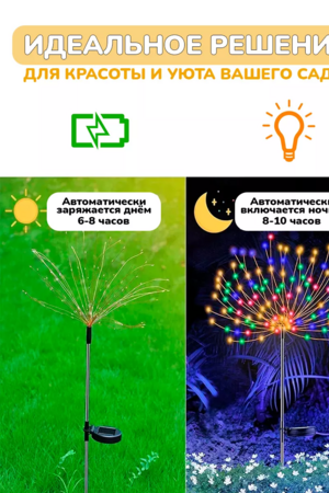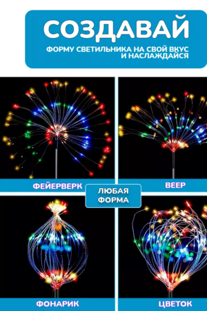 Беспроводной уличный светильник светодиодный на солнечной батарее добавит уюта и украсит ваш интерьер. Светильник фонтан - это отличное украшение вашего сада! Гибкую медную проволку светильника можно скрутить в форму цветы, колесо обозрения, дерево, фейверк, сердце или спирали и креативно украсить интерьер. Лампочки 150 диодов имеют 2 режима: мигание и ровное свечение. Ночник имеет встроенный датчик темноты (работает только в темное время, либо в темном помещении) Водонепроницаемый и долговечный светильник, в нем используются высококачественные медные провода, защита от воды IP44, емкость аккумулятора 600 мАч Ni-MH, 6-10 часов освещения после 6-8 часов зарядки от солнечного света. Светильник Автоматический - включается сам ночью и отключается днем. Оригинальное садовое украшение отличное решение для освещения на дачу, сад, дом, беседку балкон как для зимы, так и для лета.