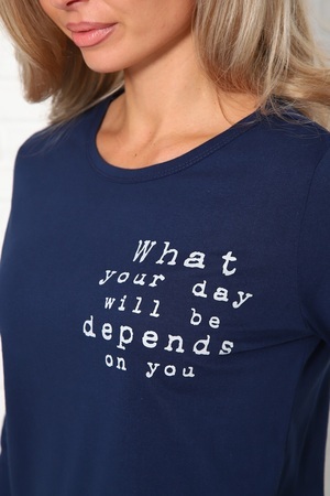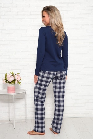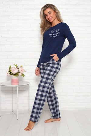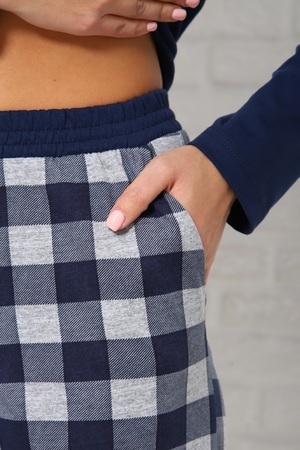 Комфортная и стильная женская пижама. Брюки в клетку с двумя боковыми карманами, на эластичном поясе и футболка с длинным рукавом, с печатью на полочке.