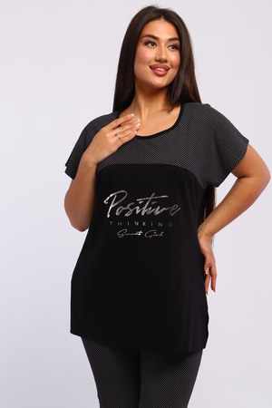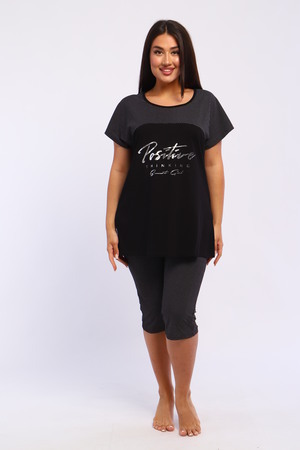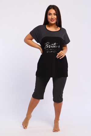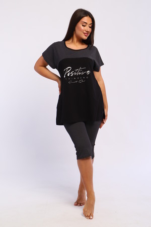 Костюм включает в себя стильную футболку и бриджи, выполненные из высококачественного материала, который гарантирует отличную воздухопроницаемость и приятные тактильные ощущения. Будьте уверены, что в этом комплекте вам будет удобно и тепло в любое время года. Он отлично сидит на фигуре и подчеркивает её достоинства, что особенно актуально для подходящей одежды больших размеров. Пижама с бриджами обеспечивает свободу движений, позволяя вам заниматься йогой, фитнесом или просто расслабляться на диване. Спортивный стиль костюма в сочетании с модными элементами поможет вам выглядеть стильно и современно даже в домашней обстановке. Футболка имеет удобный крой и не стесняет движений, что делает её отличным выбором для активного отдыха.