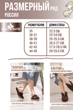 Тапочки из натурального овечьего меха "Домашнее тепло" — Идеальный Выбор для Уюта. Тапочки из овечьего меха "Домашнее тепло" — это идеальное решение для тех, кто ценит домашний уют и комфорт. Изготовленные из натурального овечьего меха на трикотажной основе, они обеспечивают непревзойденное тепло и мягкость. Этот гипоаллергенный и дышащий материал идеально подходит для поддержания оптимальной температуры ваших ног в любое время года. Тепло и Комфорт: Овечий мех — это непревзойденное решение для ваших ног. Овечий мех обладает уникальной способностью сохранять сухое тепло, что особенно актуально в летний зной и в зимние морозы. В этих тапочках ваши ноги будут в тепле и комфорте при любой температуре. Структура меха способствует улучшению кровообращения, снижению отечности и уменьшению болевых ощущений. Высокая гигроскопичность овечьего меха предотвращает потоотделение и накопление влаги, обеспечивая вашему телу сухой и комфортный микроклимат.