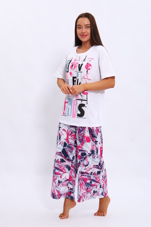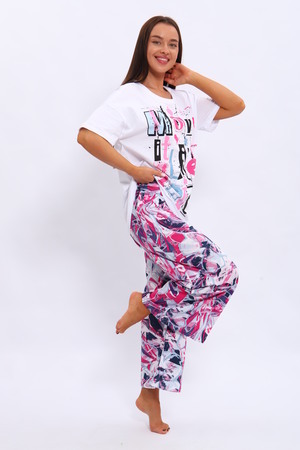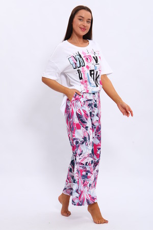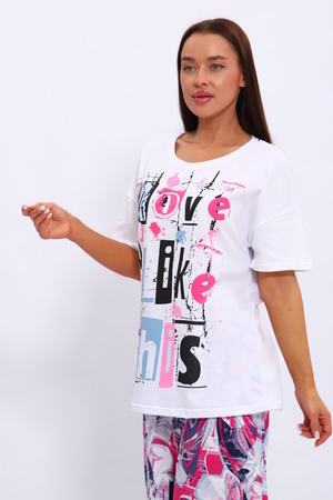 Костюм из кулирки . Футболка и брюки выполнены из мягкого и дышащего 100% хлопка. Большие размеры, футболка со спущенным рукавом с принтом, а брюки набивание широкие с карманами.