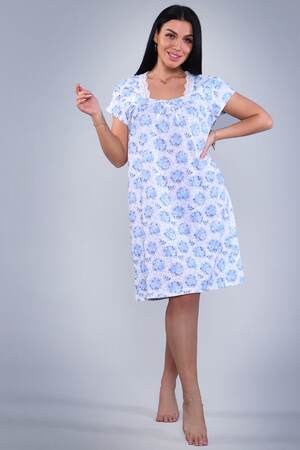 Сорочка женская из кулирки. Силуэт прямой, длина чуть ниже колен, вырез горловины фигурный, рукав короткий, отделка кружево по горловине.