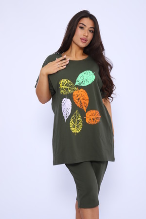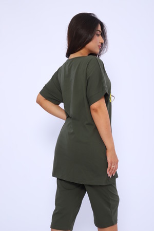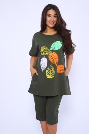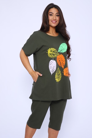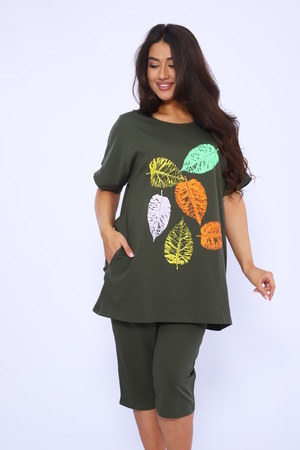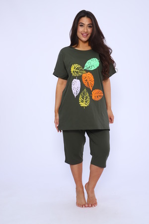 Домашний костюм женский изготовлен из ткани кулирка - мягкого и гладкого трикотажного полотна из хлопка. Костюм женский для дома и отдыха состоит из удлиненной футболки и бридж. Футболка прямого кроя, горловина круглая, обработана окантовкой, по бокам карманы. Рукав короткий. На полочке выполнен принт. За счет свободного кроя, брюки очень удобны и комфортны в эксплуатации. Состав: 100% хлопок.