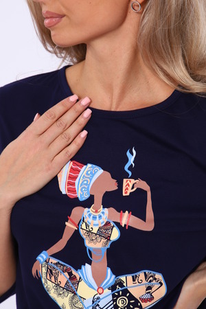 Женский костюм полуприлегающего силуэта. Рукав втачной длиной 7/8. Круглый вырез горловины с кантом. Дизайнерский принт. Брюки прямые, боковые прорезные карманы, пояс на резинке.