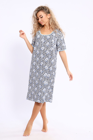 Сорочка ночная женская. Из хлопковой трикотажной кулирки. Цветочные орнаменты, фон белоземельный. По плечам коветки, небольшая сьорочка по горловине, рукава выше локтя.