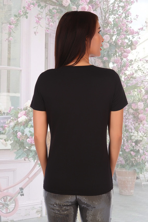 Футболка из кулирки полуприлегающего силуэта, с округлой горловиной, длиной до середины бедра. Рукав втачной короткий. Горловина обработана бейкой из основного полотна