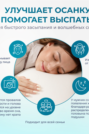 Подушка анатомическая с эффектом памяти Асветида Light 40*60 обладает классической формой с закругленными краями. Это обеспечивает правильное положение головы и шеи во время сна. Благодаря вспененной структуре наполнителя, анатомическая подушка эластичная, что способствует комфортному и здоровому сну. В составе пена с эффектом памяти – это инновационный материал, который называется пенополиуретан. Благодаря материалу «Мемори», или как его еще называют «Мemory Foam», мышцы шеи полностью расслабляются во время сна, а шейный отдел позвоночника остается в правильном положении. Анатомическая форма позволяет принять комфортное положение во время сна на боку, на животе или на спине. Кроме того, подушка предотвращает отеки лица, которые могут возникнуть при неправильном положении головы. Абсолютно гипоаллергенная, так как она изготовлена из дышащих экологически чистых материалов. Благодаря этому поддерживается комфортная температура покрытия во время сна.