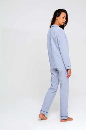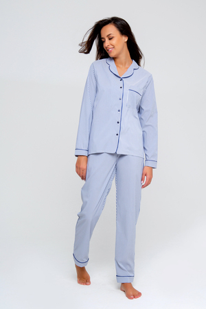 Рукава сорочки декорированы манжетами с кантом, которые органично дополняют образ, придают изделию более завершенный и аккуратный вид. Брюки в полоску имеют прямой крой, что обеспечивает комфортную посадку и подходит практически всем женщинам.