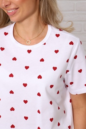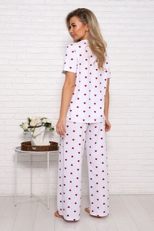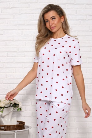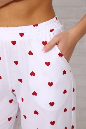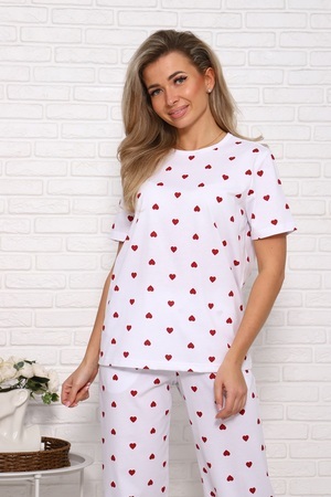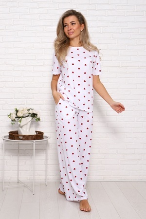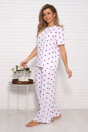 Женская пижама с брюками свободного кроя. Очаровательный принт с сердечками подарит отличное настроение. Хлопковый трикотаж обеспечит комфорт. Размеры 46-54.