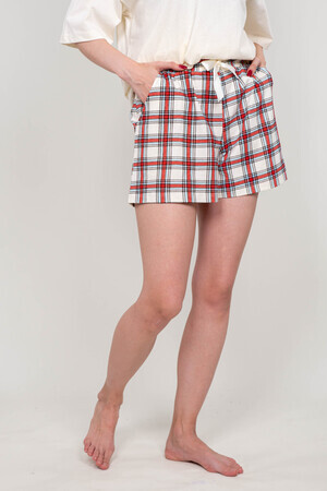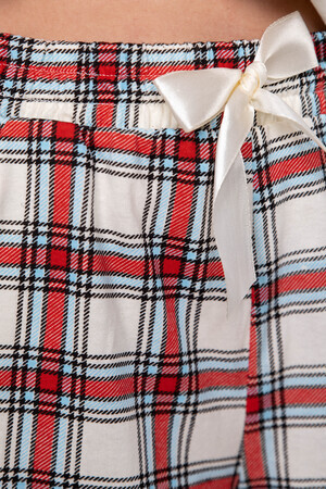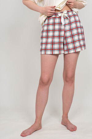 Шорты женские из набивного полотна. Пояс отрезной выполнен из основного полотна в цвет изделия, с эластичной тесьмой внутри. По линии талии пришивной элемент по центру атласный бант. На передних половинах шорт карманы с отрезным бочком. Низ шорт обработан швом вподгибку.