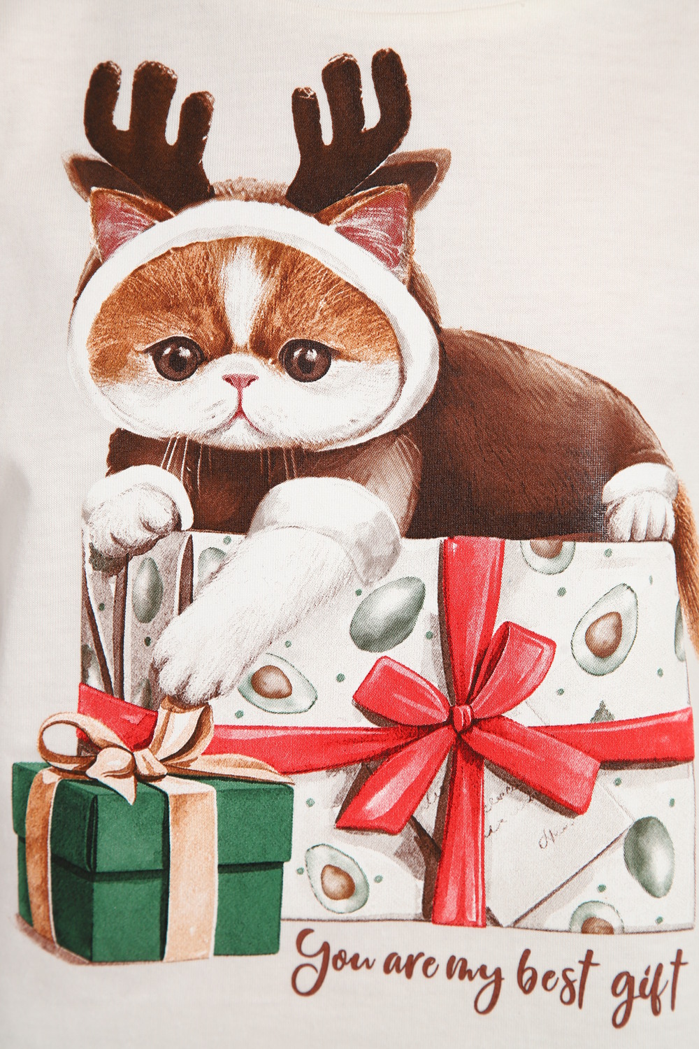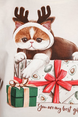 Комфортная пижама для девочки с оригинальным принтом. Пижама детская состоит из футболки с забавными котиками новогодней тематики и шорт. Дизайн ткани позволяет использовать пижаму не только для сна, но и как костюм для дома. Модель пижамы не сковывает движения ребенка во время сна. Покрой футболки свободный, шорты классические без карманов. Пижама выполнена из 100% гипоаллергенного хлопка, что позволяет коже ребенка дышать во время сна. Прекрасный подарок на праздники.