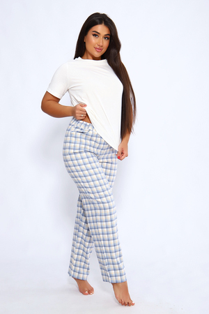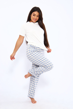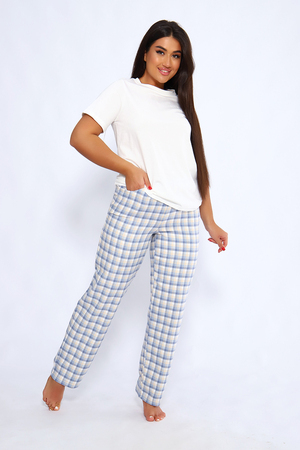 Костюм женский домашний с брюками пижамного стиля выполнен из хлопка. Футболка из кулирки с коротким рукавом, брюки на поясе с карманами из мягкой фланели. Костюм очень комфортный, отлично подойдет для дома и сна.