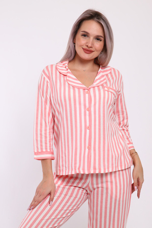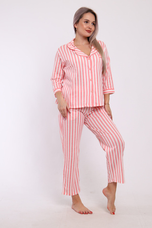 Пижама женская брюки и рубашка на пуговицах. Брюки укороченные, карманы боковые, пояс резинка, низ брюк подгибка. Рубашка на пуговицах, карман на полочке имитация. По воротнику и бортам идет внутренняя оконтовка. Рукав 3/4 манжета. Измерения пижамы фактические по изделию.