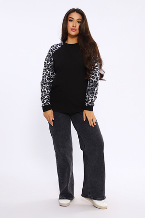 Основной акцент в дизайне сделан на асимметричную комбинацию цветов: базовый серый и черный плавно переплетаются с эффектным леопардовым принтом, создавая динамичный и современной образ. Такой свитшот отлично подойдет для смелых и уверенных в себе, кто любит выделяться из толпы.