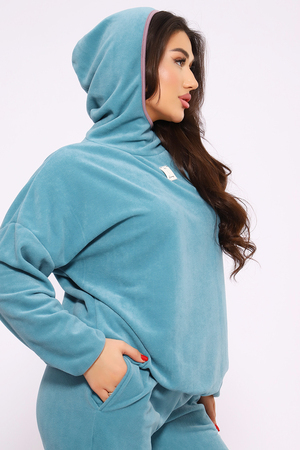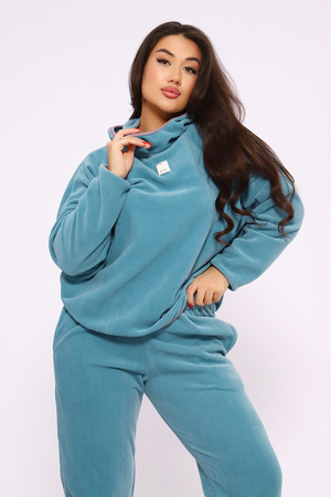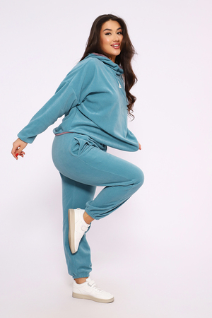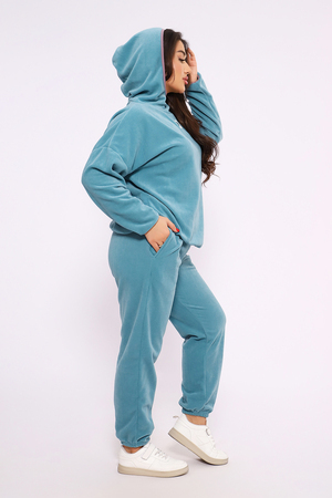 Костюм женский свободного кроя выполнен из мягкого флиса. Костюм состоит из брюк и худи. Брюки с карманами, внизу на резинке; худи с капюшоном, края обработаны кантом контрастного цвета. Костюм очень комфортный и прятный к телу, прекрасно подойдет как для дома, так и для прогулок и спорта.