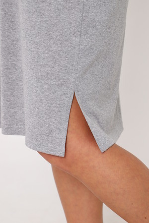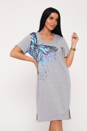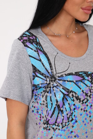 Туника женская выполнена из меланжирового трикотажного полотна кулирка. Туника свободного силуэта, втпчной рукав, горловина окантована, по бокам низа разрезы, на передней полочке выполнена печать.