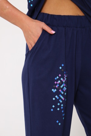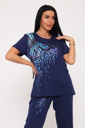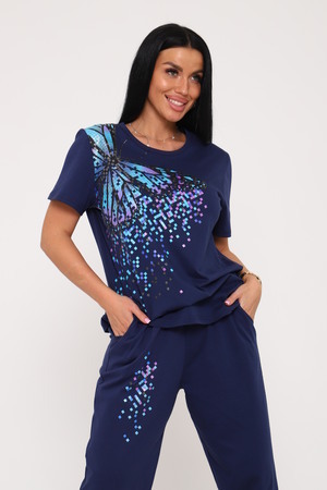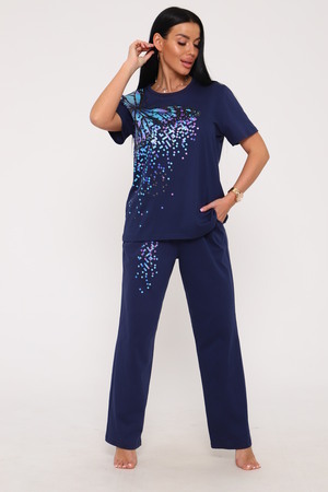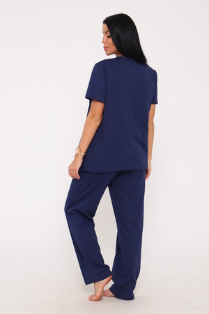 Костюм с брюками выполнен из трикотажного полотна кулирка. Костюм состоит из футболки брюк. Футболка свободного слуэта, втачной рукав, горловина окантована, на полочке выполнена печать. Брюки прямого кроя, на резинке.