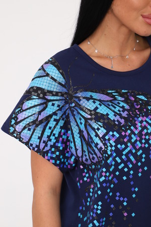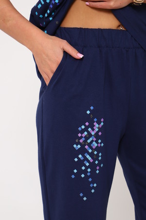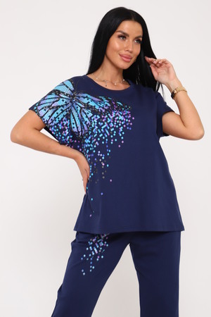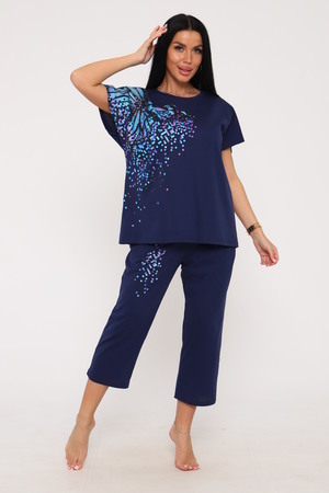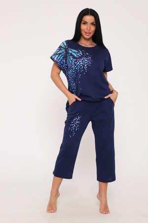 Костюм женский с бриджами, выполнен из трикотажного полотна кулирка. Костюм состоит из футболки и бридж. Футболка свободного силуэта, на полочке выполнена печать. Бриджи прямые на резинке.