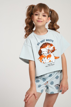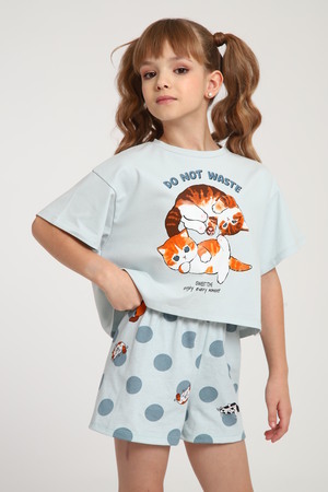 Комфортная пижама для девочки с оригинальным принтом. Пижама детская состоит из футболки с забавными котятами и шорт. Дизайн ткани позволяет использовать пижаму не только для сна, но и как костюм для дома. Модель пижамы не сковывает движения ребенка во время сна. Покрой футболки свободный, шорты классические без карманов. Пижама выполнена из 100% гипоаллергенного хлопка, что позволяет коже ребенка дышать во время сна. Прекрасный подарок на праздники.