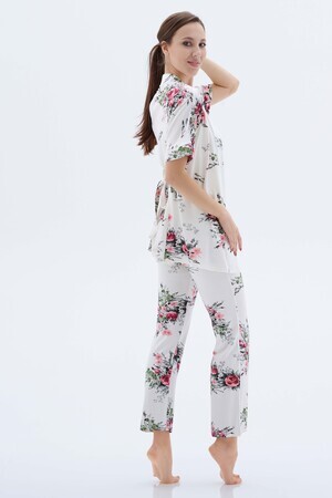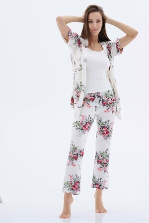 Красивые и удобные пижамы - неотъемлемая часть гардероба каждой модницы. Женская трикотажная пижама нашего бренда позволит Вам чувствовать себя дома красивой, современной, сексуальной и ухоженной. В комплект входит 3 предмета: топ с брюками и халат. Натуральные материалы в составе гарантируют хорошую воздухопроницаемость и гигроскопичность, что необходимо для крепкого сна и отличного отдыха. Короткий халат - кимоно на запах с поясом и внутренними завязками идеально сидит по фигуре и позволяет регулировать объем, создавая утонченный силуэт. Топ из лапши и брюки из качественной вискозы не стесняют движений. Используйте комплект- тройку для сна, повседневной носки и отдыха.
