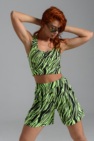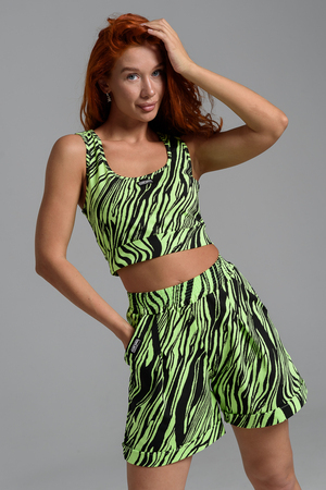 Комплект состоит из топа и шорт. Топ на узких бретелях, с округлой горловиной на полочке и вырезом "борцовка" сзади. Горловина, проймы и вырез на спинке обработаны бейкой из основного полотна. Шорты на поясе, свободные, с боковыми карманами, с декоративными отворотами по низу. В верхней части передних половинок по шву притачивания пояса расположены складки.