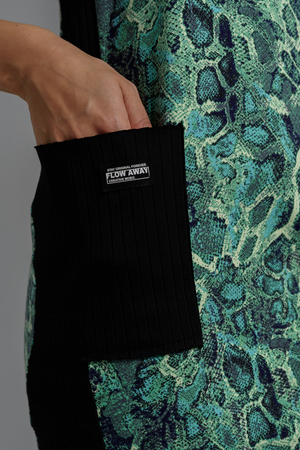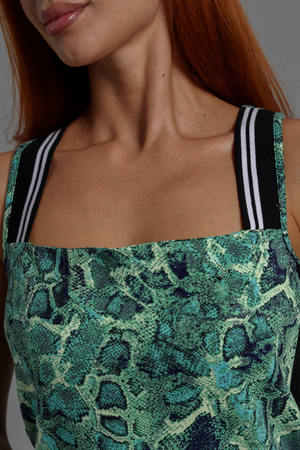Платье полуприлегающего силуэта, с крадратным вырезом спереди и "борцовкой" сзади, длиной выше колена, без рукавов. Бретели на полочке выполнены из кашкорсе с контрастными полосами. Вдоль боковых швов расположены лампасы и накладные карманы из отделочного полотна. Горловина и проймы обработаны бейкой из основного полотна.