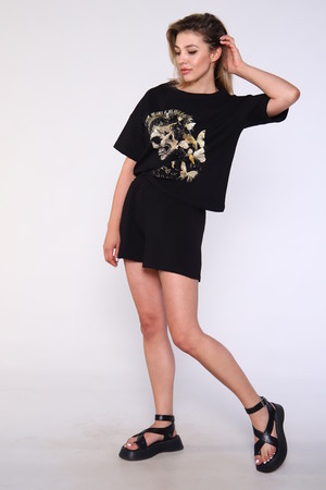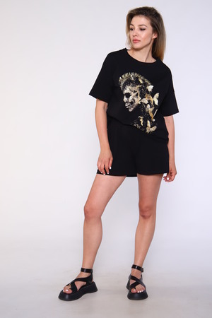 Пижама свободного кроя с шортами и футболкой. Футболка с вточным, спущенным рукавом и глянцевой печатью в стиле шелкографии. Шорты на резинке с карманами.