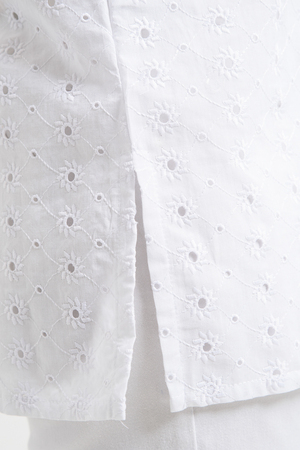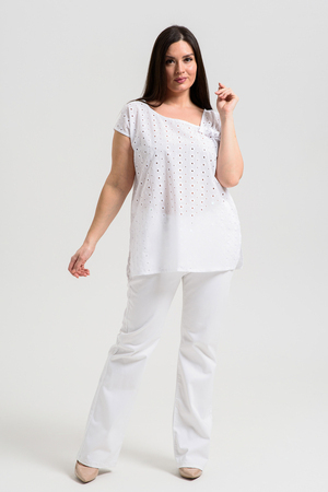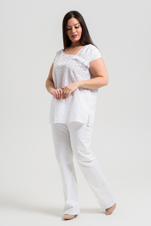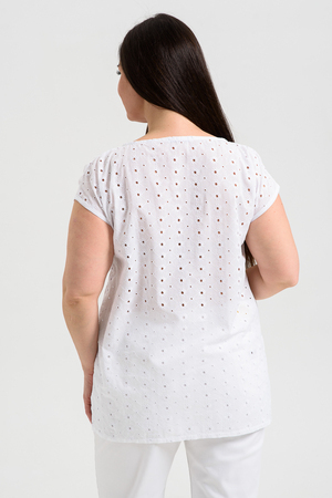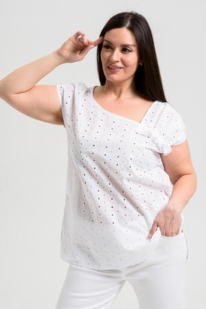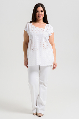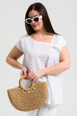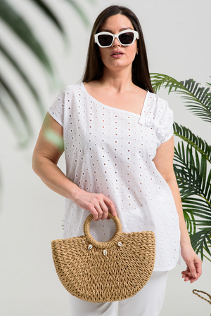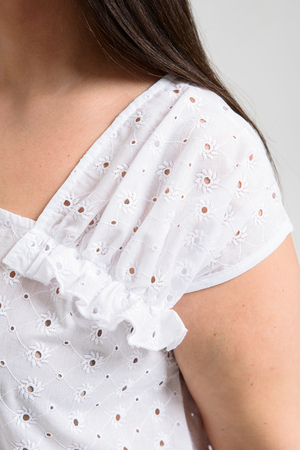 Майка женская, свободная, горловина асимметричная, нижняя часть левой кокетки полочки собрана, образуя рюшу. В боковых швах разрезы. Легкая, оригинальная майка их х/б ткани хорошее дополнение вашего летнего гардероба.