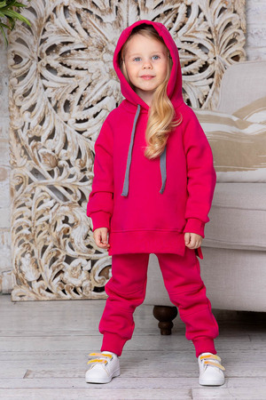Костюм "Сью" для девочки, предназначен для носки в прохладных помещениях и прогулки на улице, выполнен из плотного футера с начёсом. Толстовка на поясе, с капюшоном на шнурке, рукава-реглан на манжетах. Разрезы в боковых швах по нижней части толстовки придают модели особую оригинальность. Штанишки на манжетах, пояс на резинке, декоративная отстрочка в области колен. В таком костюме ребёнок будет чувствовать себя комфортно, уютно и всегда будет в центре внимания!
