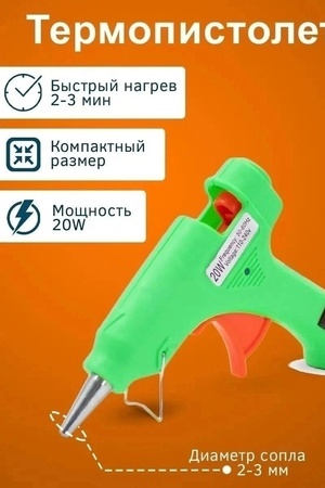 Клеевой пистолет отлично подходит для рукоделия и мелкого ремонта. Термопистолет удобен в применении и имеет кнопку включения/выключения, что упрощает работу. Клеящий пистолет термоклеевой удобен для склеивания различных деталей и поверхностей, а также для создания поделок и творчества. Клей пистолет термо отлично зарекомендовал себя для поделок, как индивидуальных, так и в тематических кружках. Клеевые стержни для горячего клеевого пистолета приобретаются отдельно. Подходит для соединения широкого спектра материалов.