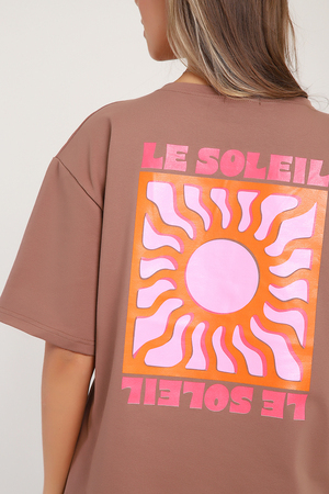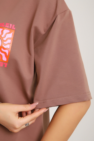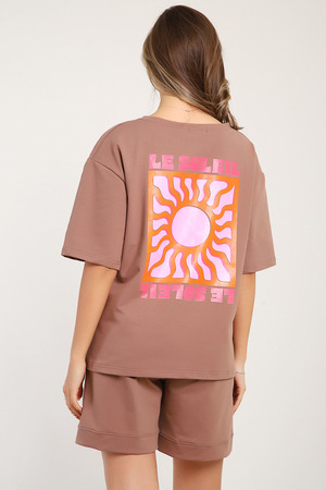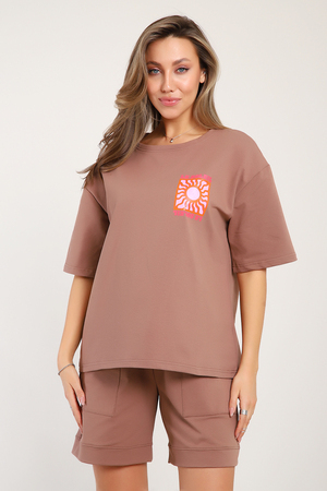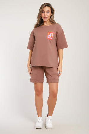 Костюм состоит из футболки и шорт. Футболка свободного кроя с короткими рукавами на спущенном плече. Шорты с накладными карманами и манжетами.