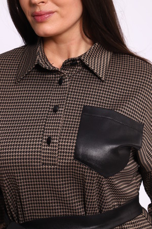 Ключевое преимущество этого платья — его изысканный дизайн. Спущенные рукава придают образу лёгкость и непринуждённость, которые так необходимы в повседневной жизни и на официальных мероприятиях. Рубашечный воротник, выполненный из стреч-кожи, добавляет нотку современности и придаёт облику благородства и стиля. Это оригинальное сочетание делает платье особенно привлекательным для модниц, стремящихся оставаться в тренде.