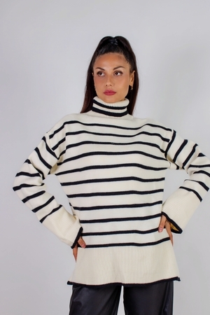 Стильный и уютный джемпер в полоску станет идеальным дополнением вашего гардероба. Изготовлен из качественной акриловой плотной пряжи, джемпер отличается не только своим актуальным дизайном, но и приятными тактильными ощущениями. Он мягкий на ощупь и абсолютно не колется, что сделает его идеальным вариантом для повседневной носки, а также для создания стильных образов в прохладную погоду.