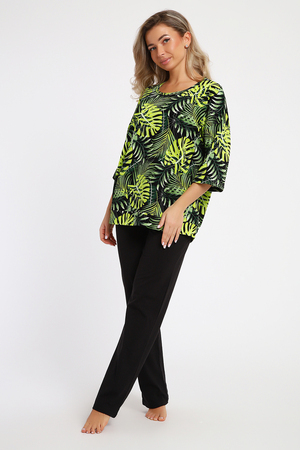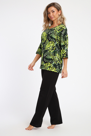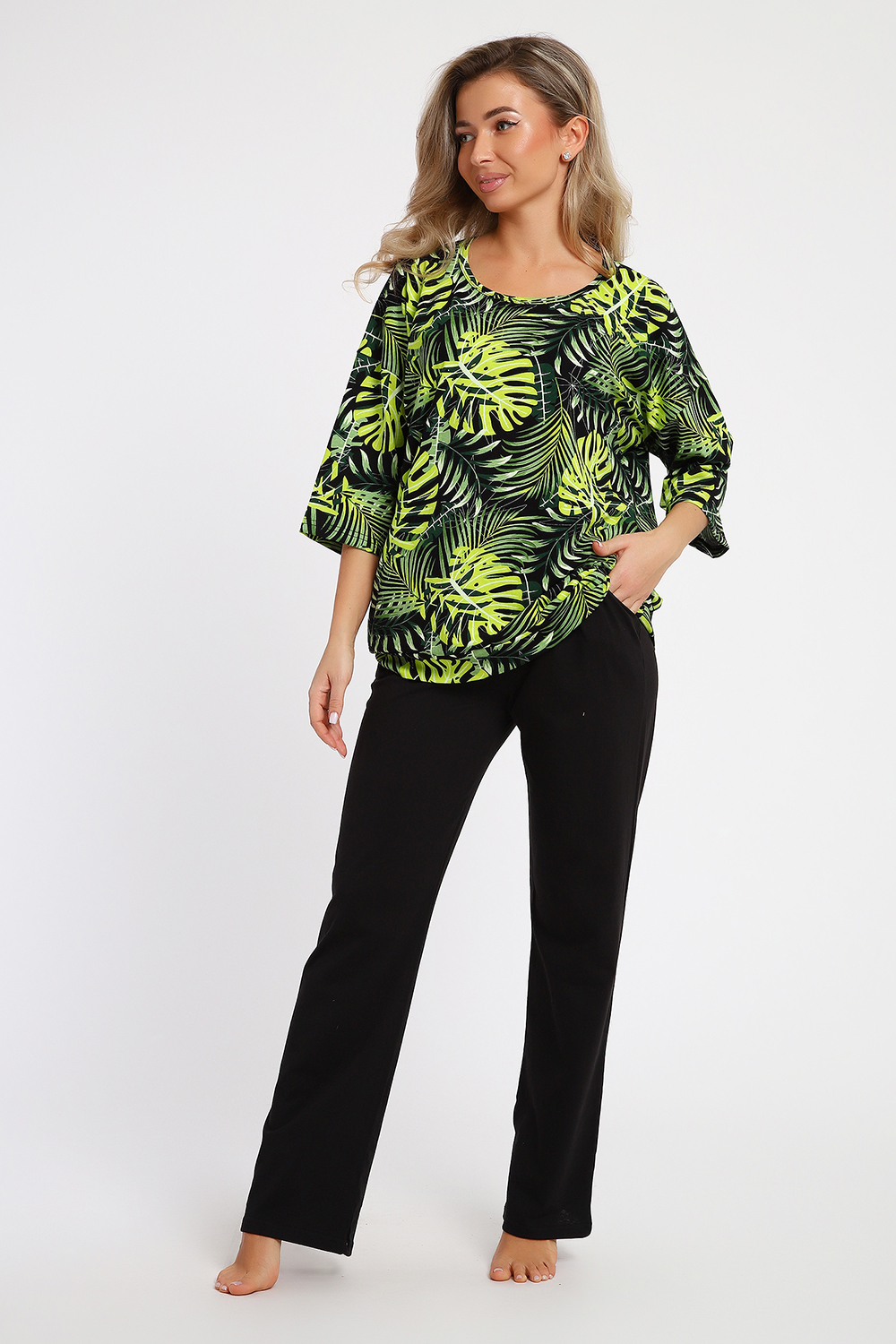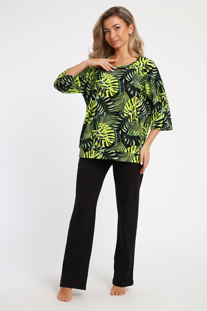 Комплект из натуральной хлопковой кулирки прекрасного качества с мерсеризацией. Состоит из кофты и брюк. Посадка свободная. Кофта с обтачкой по низу, рукава на базе спущенного плеча, длиной 3/4. Брюки прямые, с боковыми карманами.