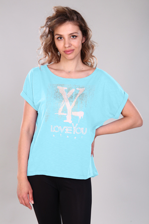 Стильная футболка из хлопка. Свободная модель со спущенным рукавом и боковыми разрезами, имеется декоративная, глянцевая печать в стиле шелкографии с добавлением глитера.
