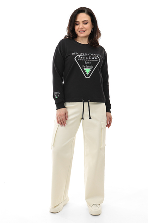 Свитшот свободного силуэта, прямого кроя. На переде печать с серебром, которое будет эффектно искриться на солнце. Линия плеча спущена. Манжеты из кашкорсе подобраны в тон ткани. Низ изделия регулируется шнуром.
