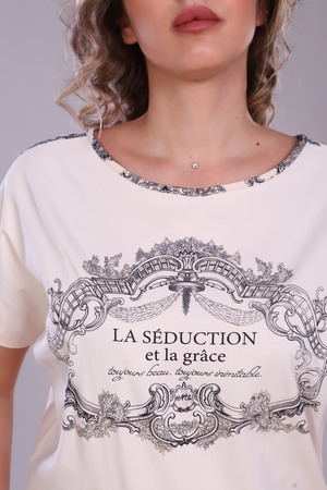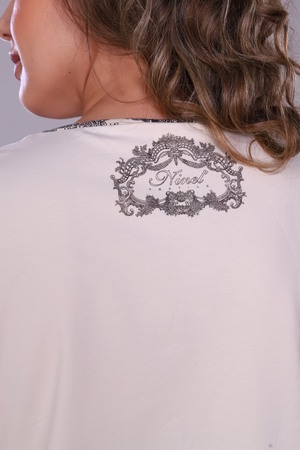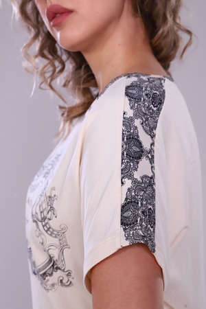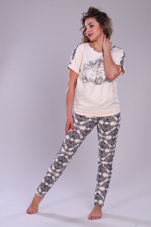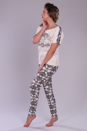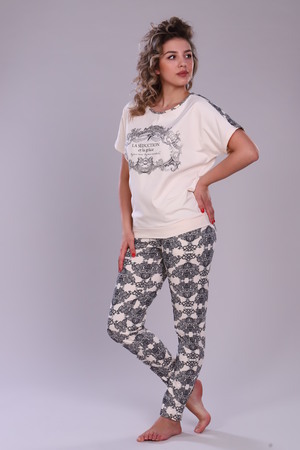Пижама женская с широкой футболкой и короткими рукавами, низ выполнен из зауженных к низу брюк и прорезными карманами в шве.