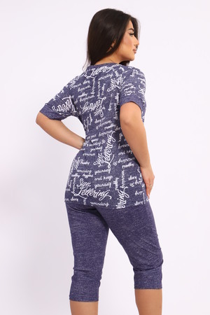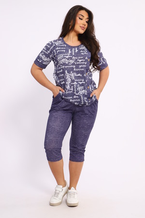 Костюм женский выполнен из трикотажного полотна кулирка. Костюм состоит из футболки и бридж. Футболка свободного силуэта. Бриджи свободного кроя чуть ниже колен.