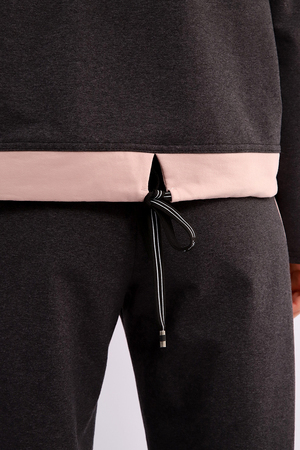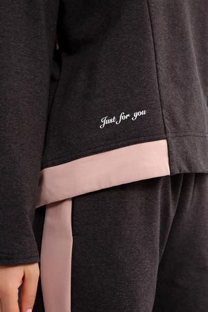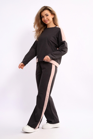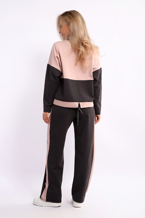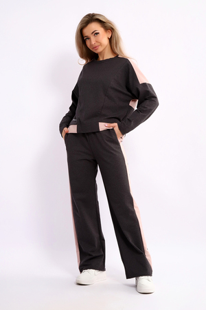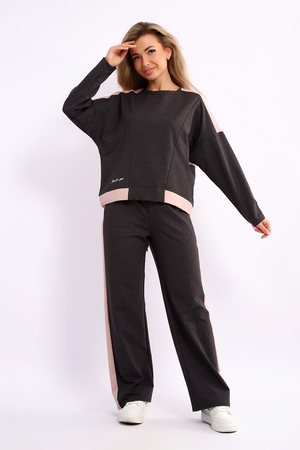 Костюм женский из мягкого, тонкого комбинированного футера . Свитшот с рельефами, в свободном стиле Oversize. Круглая горловина обработана обтачкой, спущенная пройма, длинный рукав, с надписью на передней полочке. На спинке кокетка, низ на широком манжете с декоративным шнуром. Брюки- трубы с лампасами и удобными карманами в боковых швах. Стильный, комфортный костюм идеальный вариант для повседневного гардероба.