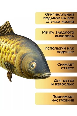 Эта большая мягкая рыба станет отличным подарком для взрослых и детей. Каждый рыбак мечтает о таком оригинальном и полезном сувенире. Украсит любой интерьер, будь то комната увлечённого рыбалкой мужчины или уютное семейное гнездышко, детская. Это верный компаньон на диване во время просмотра фильмов о рыбалке или обсуждения новых трофеев с друзьями, хороша при поездках на машине, походах - её можно использовать как удобную подушечку, которая поддерживает голову и шею в комфортном положении.