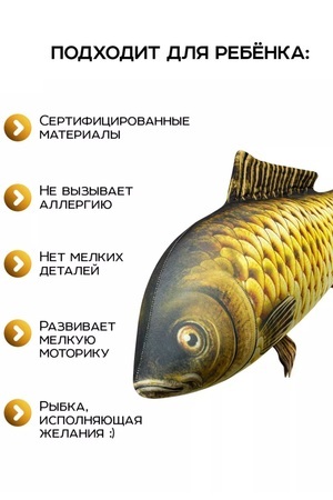Прорисованные чешуйки, объёмные плавники придают реалистичный вид, позволяющий использовать её в качестве элемента декора для тематических вечеринок или фотосессий. Все будут в восторге от вашего прекрасного решения сделать подарок папе, мужу, сыну или просто знакомому любителю рыбалки. Это одновременно мялка и подушка для восстановления сил после насыщенного дня. Очень приятная на ощупь, рыбка, вызывает желание помять и потрогать её снова и снова.