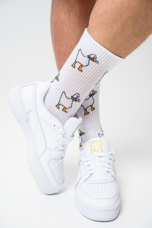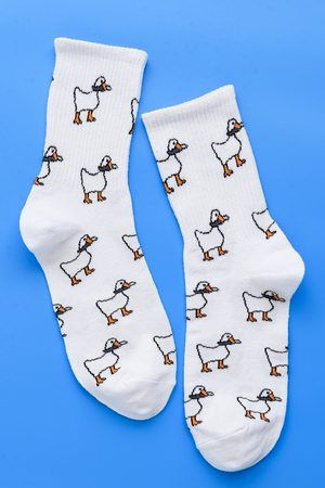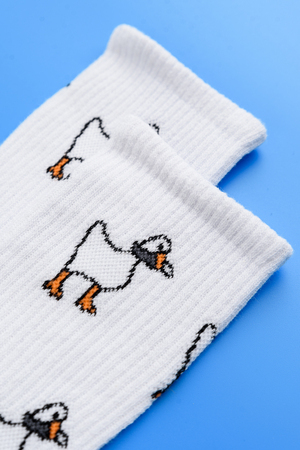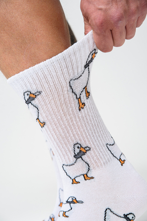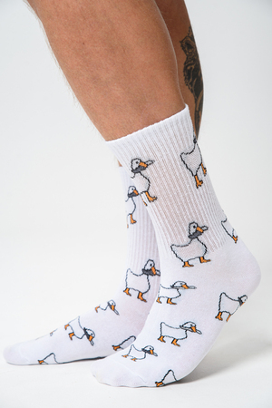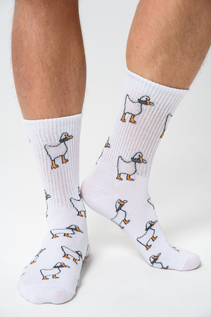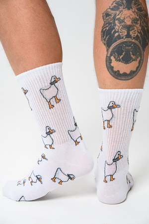 Трендовые носки для мужчин. Широкая резинка, по всему носку изображение гусей.